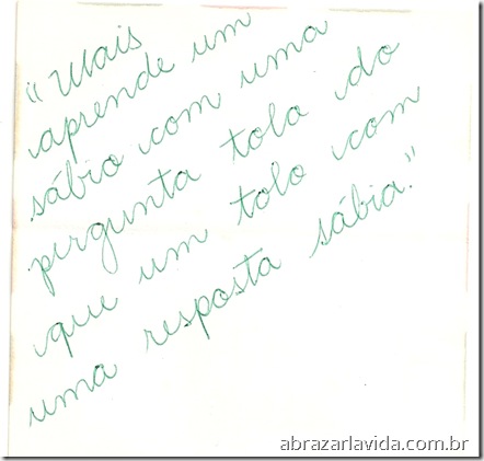 Vira e mexe tem alguém usando uma frase no estilo “autoajuda” para, ou querer mostrar-se mais intelecto que os demais, ou para transmitir algum ensinamento, de fato. Uma das manias que eu alimentava numa época distante era de anotar algumas destas frases. Mas diferente dos textos do alfarrábios que eu juntava-os em uma pasta, estas frases eram anotadas como davam para que eu não as esquecesse de tê-las comigo: em um pedaço de papel ou em um canto de livro ou revista, guardanapo, na mão (para depois passar ao papel)… E acabavam ficando largadas em alguns bolsos ou em minhas coisas (pastas, livros etc). Na última mexida de tralhas que fiz nas férias, encontrei esta que, inclusive, não tinha a fonte de onde a retirei, mas que, mesmo assim, é uma daquelas frases que nos faz ver que, às vezes, queremos tanto passar um conhecimento justo e correto a alguém, porém este alguém não é aquele que você acredita ser, é um ser tolo, fechado em um outro mundo onde nem o mundo do faz de conta faz sentido para ele. Não me lembro em que circunstância escrevi esta frase, mas deve ter sido vendo TV ou ouvindo Rádio: